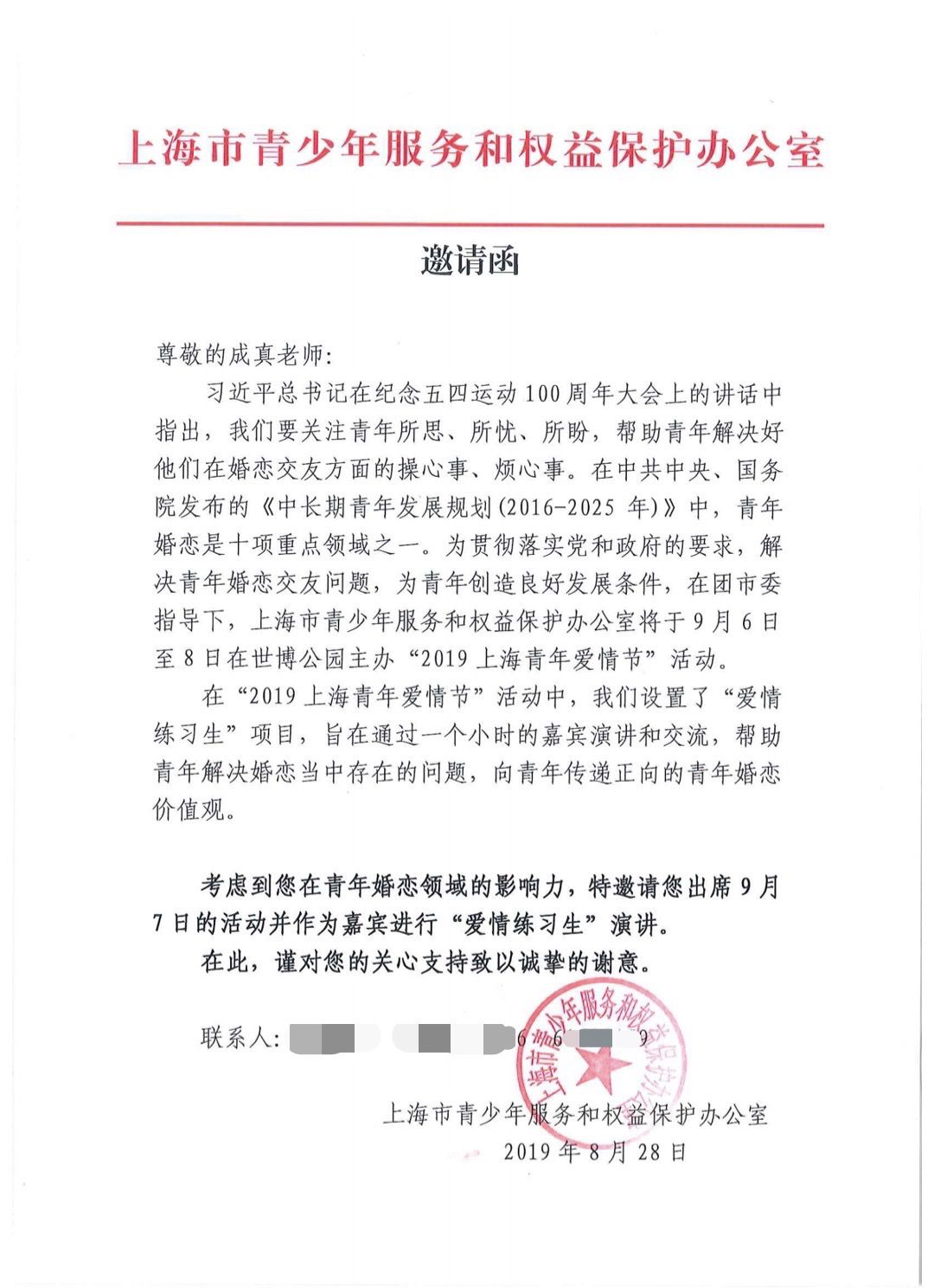 成真于2019年9月6日受上海市青少年服务和权益保护办公室的邀请参加上海爱清节进行演讲。帮助青年解答婚恋中遇到的烦恼,传递正向的青年婚恋价值观。